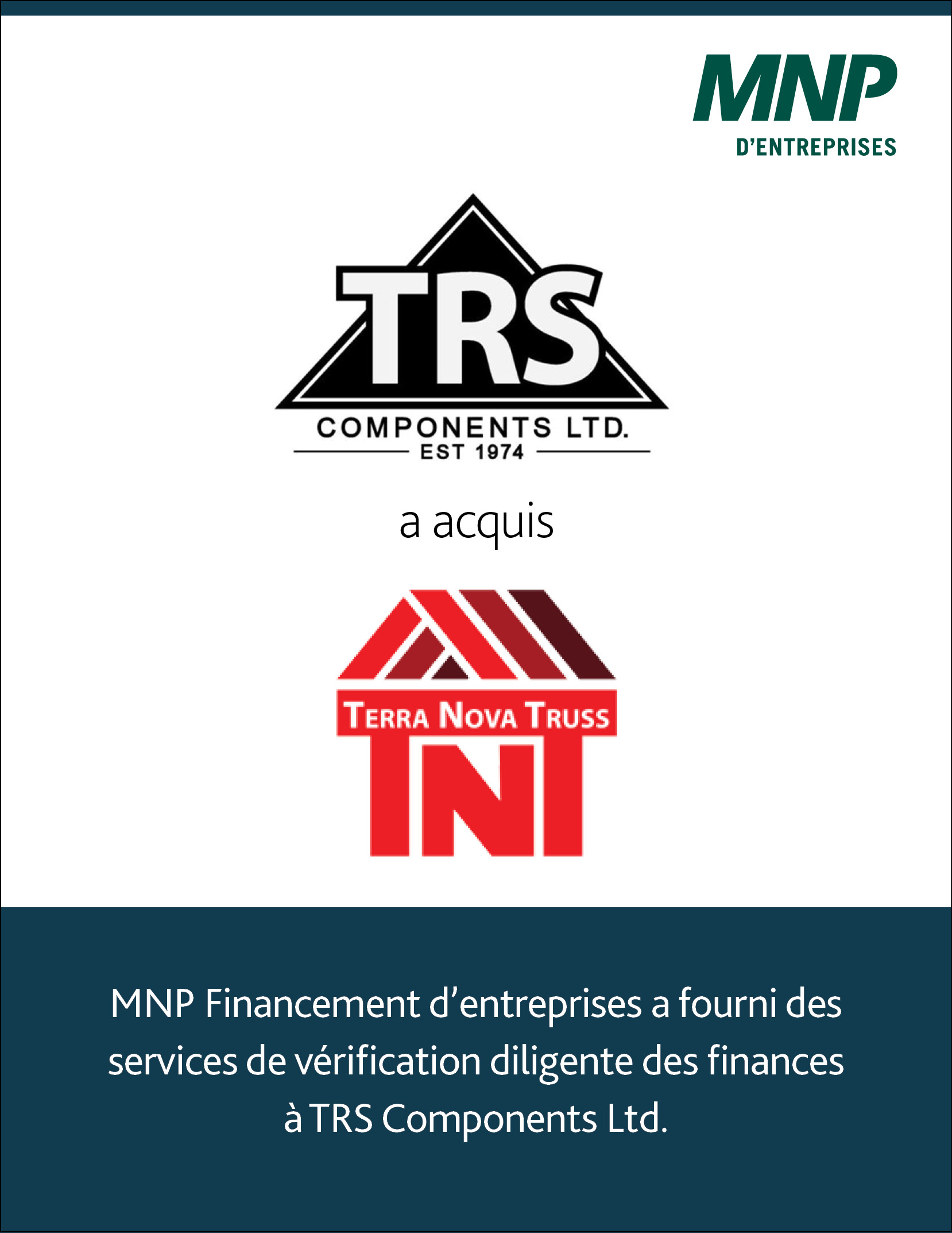 TRS Components Ltd. a acquis Terra Nova Truss. MNP Financement d’entreprises a fourni des services de vérification diligente des finances à TRS Components Ltd.